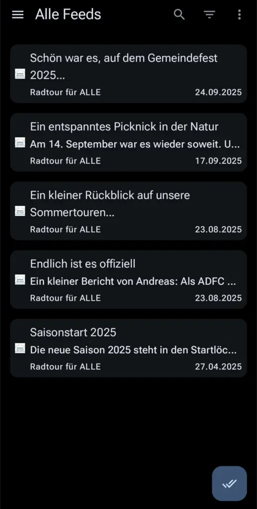 Einfach die Feed Adresse https://radtourfueralle.de/feed hinzufügen und schon gibt’s bei neuen Beiträgen eine Benachrichtigung und ihr könnt sie auch sofort in der App lesen.